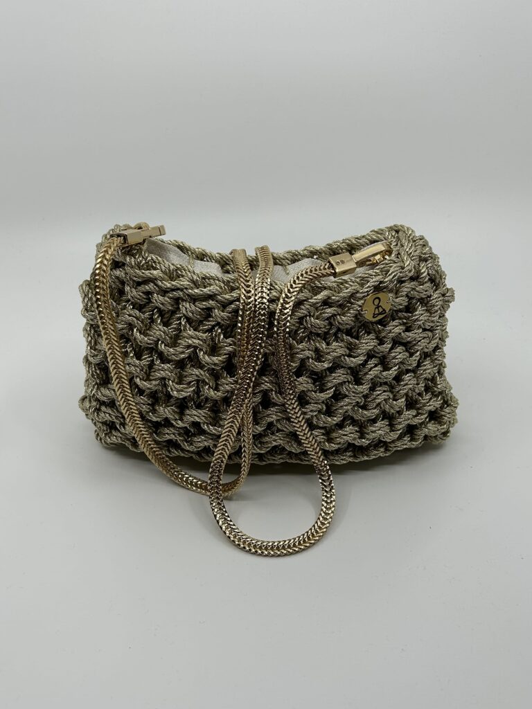 Está elaborado artesanalmente con un tejido exclusivo que combina 81% algodón reciclado y 19% poliéster reciclado, logrando un acabado metalizado de gran impacto visual. Este detalle le da una personalidad única, diferenciándose dentro de la colección por su carácter sofisticado y festivo. Su forro interior y el cierre de cremallera garantizan comodidad y seguridad.