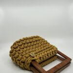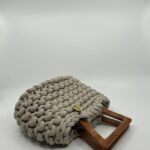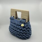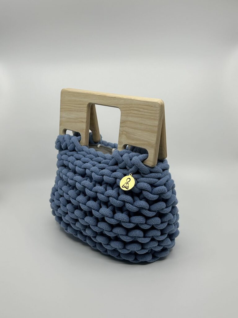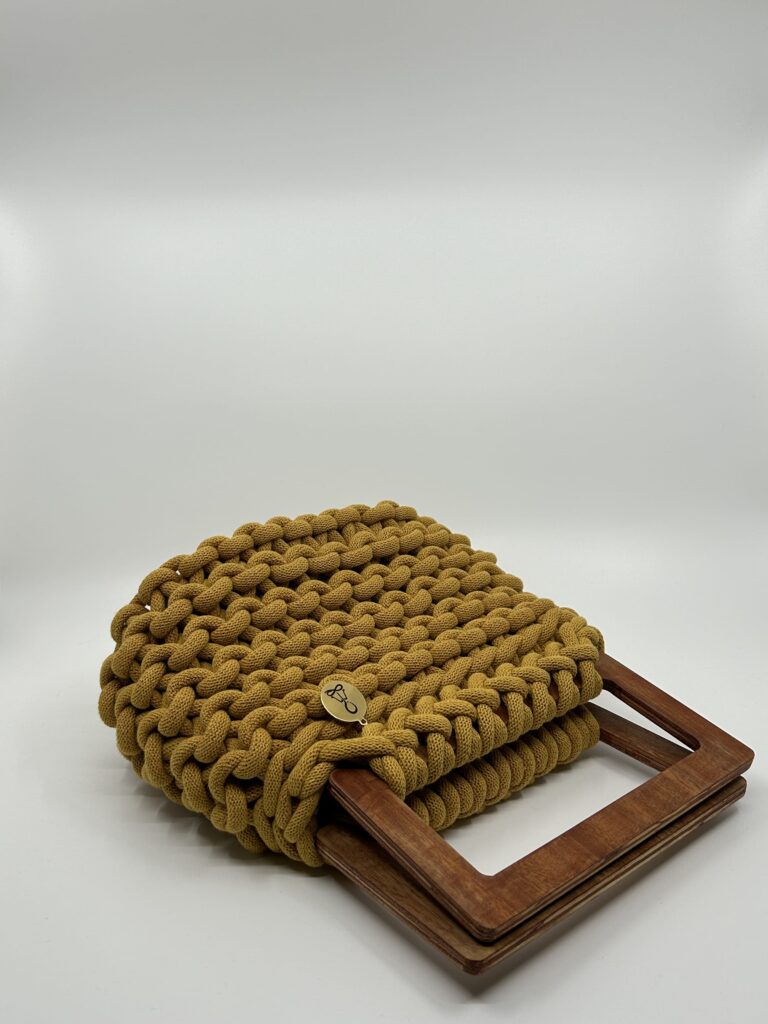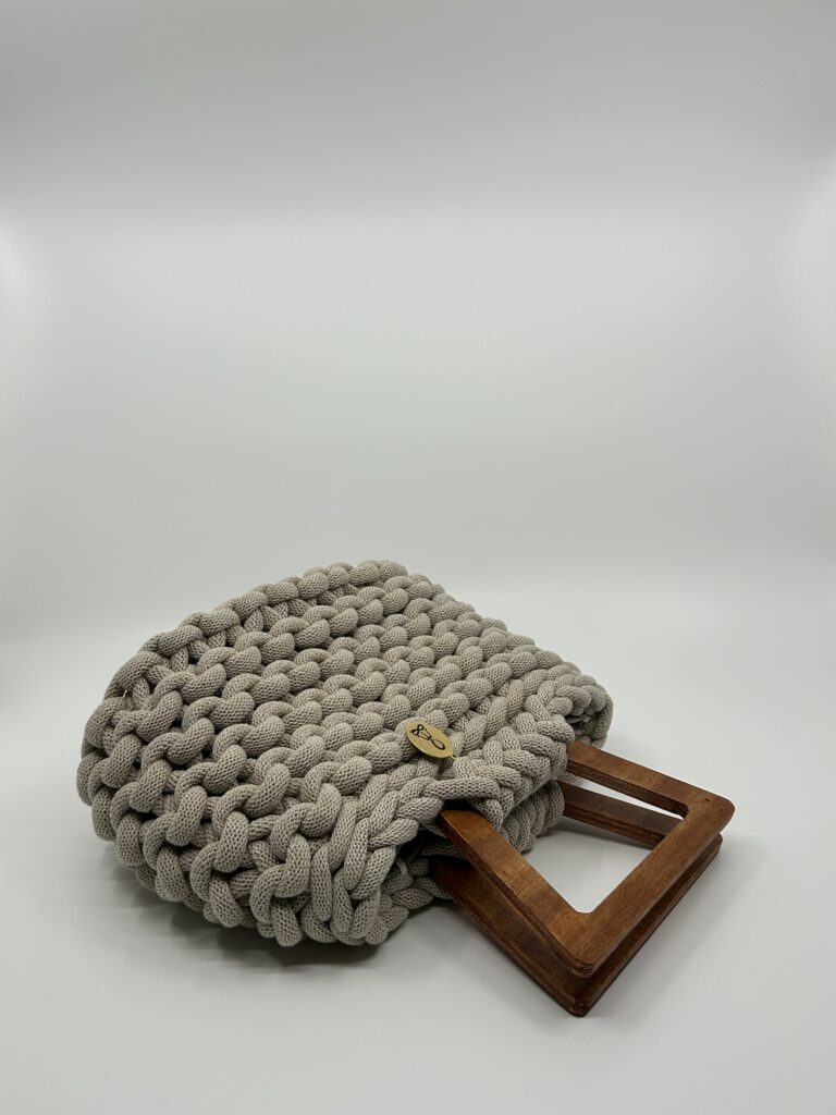 Destaca por su asa de madera natural artesanal, disponible en cinco formas diferentes (redonda, cuadrada, rectangular, trapecio invertido y tipo puente). Esta posibilidad de elección convierte cada bolso en una pieza aún más personal y exclusiva. El cuerpo, en crochet artesanal con algodón reciclado certificado, aporta textura y carácter único.